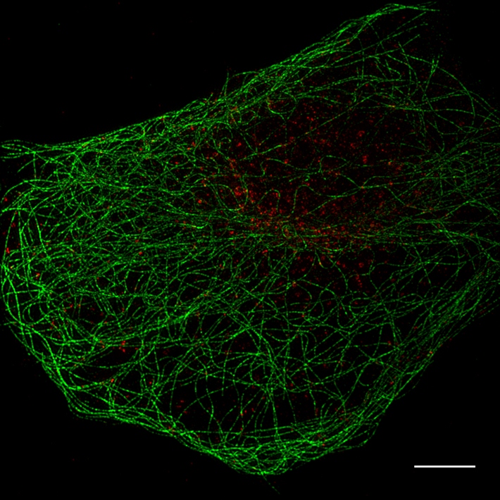 说明:由结构照明超分辨荧光显微镜OMX拍摄到的活细胞内的微管与微管相关蛋白