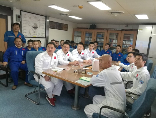 正在西太平洋执行任务的中科院海洋研究所“科学”号科考船组织船员同步收看