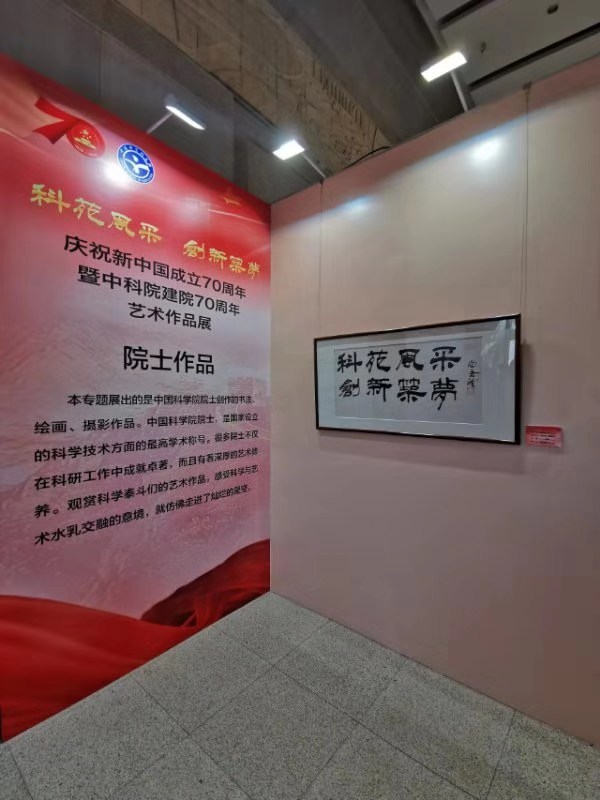 为庆祝新中国成立70周年、中国科学院建院70周年,11月11日,由中国科学院文学艺术界联合会主办、策划的“科苑风采 创新筑梦”艺术作品展在中科院创新文化广场开幕。本次展览共展出了包括中科院院士书法、绘画、摄影作品在内的近200幅作品,以及设计和收藏的邮品,并特邀了知名艺术家助展。