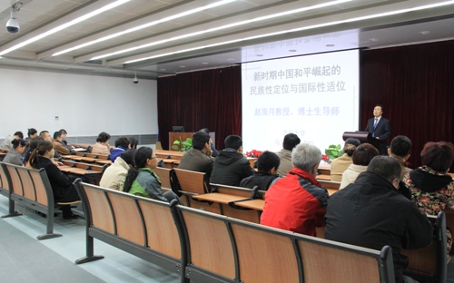 赵海月教授以《新时期中国和平崛起的民族性定位与国际性适位》为主题作了精彩报告,围绕中国和平崛起的政策性解读、民族传统性格分析、国际背景考量等三方面解读了中国的民族性定位与国际性适位,并分析了中国崛起面临的风险挑战。阐述了中国和平崛起的定义和内涵;分析了中国坚持和平崛起走和平发展道路的内因