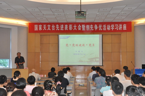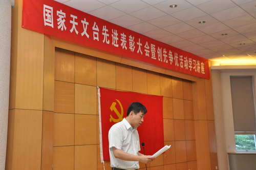为表彰先进,弘扬正气,充分发挥党员先锋模范作用,推动中科院国家天文台各项工作再上新台阶,台党委决定表彰一批先进支部和优秀共产党员。7月13日上午,在中国共产党成立89周年之际,国家天文台召开先进表彰大会暨创先争优活动学习讲座,为国家天文台创先争优活动奠定了良好的开端。原中纪委驻中国科学院纪检组组长、院党组成员王庭大同志和协作一片组织员李利军同志应邀参加会议。出席大会有台长严俊,党委书记刘晓群,党委副书记、副台长郑晓年和副台长郝晋新。会议由刘晓群主持。