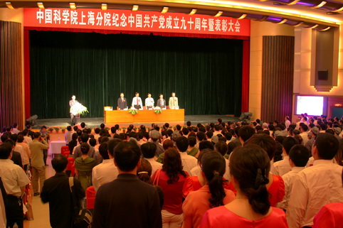 6月7日,在庄严的国歌声中,中科院上海分院召开纪念中国共产党成立九十周年暨表彰会。上海市委组织部局级巡视员杨建荣,上海市科技党委副书记陈龙,上海分院党组书记、副院长、沪区党委书记王建宇,上海分院常务副院长朱志远,上海分院副院长张旭,上海分院党组副书记、沪区党委副书记李正华出席表彰大会并颁奖。