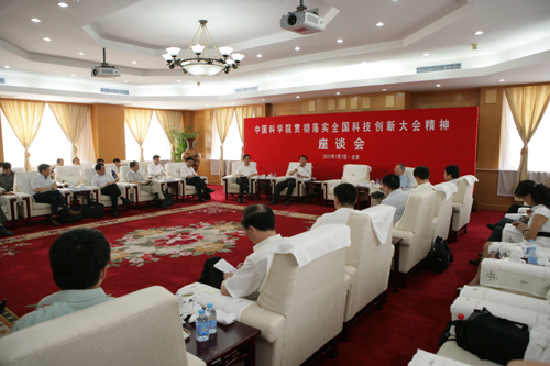 7月7日下午,中国科学院在北京召开贯彻落实全国科技创新大会精神座谈会,学习贯彻刚刚闭幕的全国科技创新大会精神和中央领导同志在大会上的重要讲话精神。中国科学院院长、党组书记白春礼,党组副书记方新出席座谈会。党组成员、副秘书长何岩主持座谈会。副秘书长潘教峰,全院参加全国科技创新大会的科技人员代表,院机关有关部门和京区部分研究所党政负责同志出席座谈会。