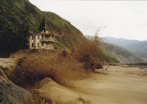 另一张泥石流冲击东川站一号观测楼的照片,拍摄过程就一波多折,要拍摄到富有较强视角冲击力的动感强烈的泥石流照片是很不容易的。从开始构思到最后成功抢拍到,前后共历时了八年之久。山地所与泥石流打交道的人们都知道,泥石流暴发时往往伴随着狂风暴雨,而蒋家沟的风异常猛烈,雨是斜着横扫过来的,在狂风暴雨中人根本无法站立。更何况泥石流暴发时绝大多数又都是在无法拍摄的夜晚,想要拍到一幅好的泥石流动感照片,是非常不容易的。在泥石流暴发时,我们为了采集到泥石流流动中的活样,专门开挖了一条直通蒋家沟河床的斜道,这样在泥石流暴发时,不管泥位在什么高度,都能零距离靠近观测,采样和拍摄。机遇属于有准备的人,在经历了八年多的等待和无数次拍摄的失败之后,机会终于来了,1996年7月5日,蒋家沟在罕见地沉寂了一个多月之后,那天的凌晨零点23分,狂风暴雨夹着电闪雷鸣,一场较大规模的泥石流灾害在蒋家沟暴发了。我们严阵以待,早已在各自不同的岗位,密切地注视着那正在狂暴肆虐的泥石流:“流速多少米/秒、流深...!”一阵阵呼喊,此起彼伏,布置在上、下观测断面所有仪器都在观测记录下泥石流的各种数据,探照灯照亮了漆黑的夜空;暴风雨中,整个观测现场井然有序地开展着工作,凌晨1点10分45秒,我操纵采样设备冒着危险取到了第一个泥石流现场样品,测量、称重、计算,天哪,每立方米体积重量竟然高达2.28吨,即泥石流的容重为2.28!随后,2.17、2.19、2.195几个级别容重的样品也分别成功取到;天快亮时,肆虐了五个多小时的泥石流终于停息,但雨仍在不停地下着,只是小了许多。上午11时56分,泥石流再次暴发,东川站的人们,来不及吃午饭,又精神百倍地奔到观测第一线,观测采样、记录各种现场数据,午饭由站领导亲自送到观测第一线。在又成功的取到了5个现场活样以后,动力电网突然在16点停电,雨也悄悄的停了,动力采样无法进行。我抓起照像机和人工取样的小桶,顺着直通沟床的斜道冲到正在快速流动的泥石流边不到1米远的地方,脚下的沟壁在泥石流猛烈冲刷下崩塌,强烈的震动几乎让人窒息,泥浆石块在眼前碰撞冒烟、崩裂飞溅,向着一号观测楼猛烈地撞击,腾空二十多米高后又重重地跌下,我头脑中构思多年的图象,几近完美地展现在眼前……。我飞快地设定光圈与快门速度,构图调焦一气呵成,用手中不能变焦的50mm标准镜头的照像机对准了那稍纵即逝的瞬间,弊住呼吸,紧张而又轻轻的按下了快门……。“危险”!耳边传来几声呼喊,我赶紧转身向回跑,刚跑开,扑上岸的泥石流飞溅着泥浆石块,坠落在我刚才站立的位置,我身体后背和头上溅满泥团,好悬!刚跑回到斜坡上部,差点迎头撞上山地所吴积善所长和张有富副研究员,原来是他们一直跟在我身后,为我观察和保护我,以确保安全。吴所长略带责备的口吻,关切地询问我有没有被石头砸着,我摇摇头上气不接下气地说:我终于拍到泥石流冲击一号楼的照片了,吴所长略带嗔怒的说:那么危险,你不要命了?张有富副研究员紧接着说到:看见你往沟边跑,我们赶紧跟来,太危险了,刚才那一阵你要跑晚一点,就……,我望着两位可敬的老师,一句话也说不出来,看表的双眼不由自主地模糊了,时间正好16点30分,随后我高兴地向他们嚷到:我终于拍到泥石流冲击一号楼的照片了!在那个年代,没有智能像机,照像机是要装上胶卷才能拍摄,而后还要送到专业像馆冲印出来,成功与否只有那时才能初见分晓。第二天将胶卷送到20多公里外的东川城区,在经过了几天焦急不安的等待之后,终于拿到了冲扩成功的照片和底片,哇,好漂亮的照片!见到了实物,那一颗始终悬着的心,才终于落下来了。