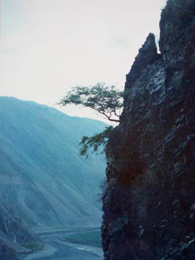 在东川蒋家沟站站区公路悬崖陡坡上,一片断崖特别引人注目,绕过了它这个弯,中国科学院东川泥石流观测研究站的全貌就尽收眼底,在这片断崖下一大块支离破碎的变质岩,脱离了母体孤悬在断崖边,它的脚下就是我们进入观测站的狭窄陡峭的简易盘山公路,而路的左边就是深达二百米的沟谷,蒋家沟主沟就在山脚下静静地流淌,断崖上由于只有破碎的岩石,寸草不生,却独有这么一棵当地耐旱的酸浆树,从贫瘠的岩石裂逢中,倔强地伸出了枝杆,迎着蒋家沟强劲的山风轻轻摇戈,给孤岩增添了点点翠绿,绽放出生命的光华与顽强。它被我们老东川站人亲切地称呼是东川站的迎客松;所有进出东川蒋家沟站的人们,都会在有意无意中多看它几眼,在那个环境条件极端恶劣的情况下,它却生长得那样繁茂,那样挺拔俊秀。那份执着的坚守和凝重深情的守望,不正是对我们成都山地所人最真实的写照吗!山地所东川站的人们,每年5至9月,只要钻进了这环境险恶的深山沟里,就象这扎根石缝的酸浆树一样,扎根山野,默默地为祖国山地科学事业刻苦奉献,许多人甚至几个月都不能出山一次,他们用自己的青春和汗水,无怨无悔,书写下了那辉煌的诗篇。“暮色苍茫谁守望?蒋家沟站树倔强,迎来八方远行客,佑蔽平安科研忙,远眺蚂蚁坪雨狂,近探滑脚坡下荒,泥石流猛滩地滥,磅礴乌蒙我担当!”山地所老一辈,新一代的那么多为祖国山地科学事业默默奉献,刻苦奋