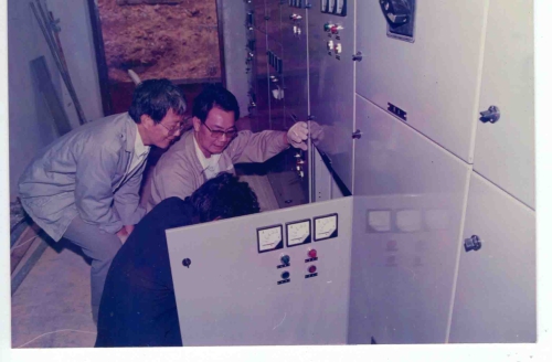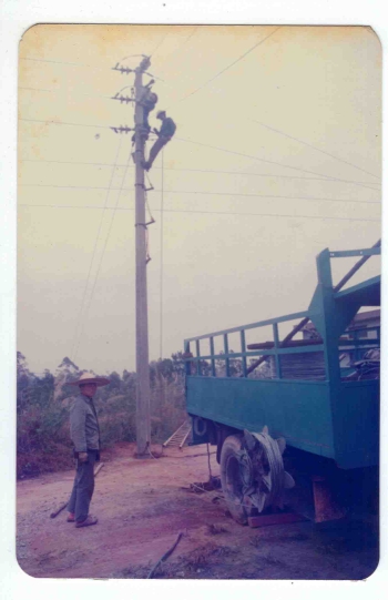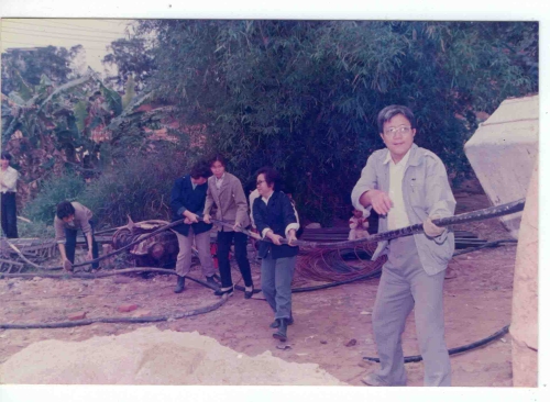 此外,当时广州用电非常紧张,白天“开三停四”,就是一个星期三天有电,四天无电。这导致科研工作无法顺利开展,必须尽快申请双回路供电。我们向来访的广州电视台记者讲述了这一困难,为此,该记者第二天就到当地供电局进行了采访,题目大致内容为:改革开放中你们怎么为科研服务的?事后不久,一档《供电局为科研开绿灯》的栏目在电视台播出了。供电局潘局长将我们早已递交上的关于申请双回路供电的报告批给了赵总工程师,赵工率队来研究所负责安装与调试(照片4,5)。基建办的同志充分发挥了吃苦耐劳的精神品质,全体出动拉外线(照片6),该线总长约3公里。在大家的辛勤付出下,不到一个月就开通了双回路供电!