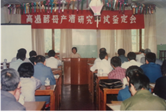 这是中国科学院武汉病毒研究所原高温酵母课题组蒋亚平同志1987年6月在“耐高温酵母酿酒的研究”中试鉴定会上作工作报告时的场景。武汉病毒所开展耐高温酵母酿酒研究工作从选题到研究以及工厂的大规模应用,直至获得国家技术发明三等奖,其过程真实记录了一代科研工作者奋斗拼搏的历程。