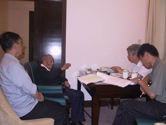书稿几经修改,终于要付梓了。2005年8月下旬,适逢王老在长春参加一个国际会议,由陈星旦院士组织,请王老对书稿提出最后的修改意见(见照片3)。此前,对于书中的年谱(编年大事记)部分,已由王老助手蔡恒源老师逐句读给王老(那时王老眼疾已经很重了),做了一些修改和更正。此次,王老对年谱部分又做了一些说明。他说,年谱(编年大事记)中有许多我出国的记载,要写清楚每次的访问目的、考察内容及作用意义。王老准确回忆了有重要意义的几次出访活动,时间、考察过程、所看所想,如数家珍。有些是因一事出访多地,或因多事出访一地,王老都能清晰记忆、准确说明。我们都对90高龄的王老超常的记忆力感到由衷赞佩。特别是每次考察回国后,王老都要亲自撰写考察报告,提出学习借鉴的建议和应对的措施,这些都对后来我国科技事业的发展起到了重要作用。