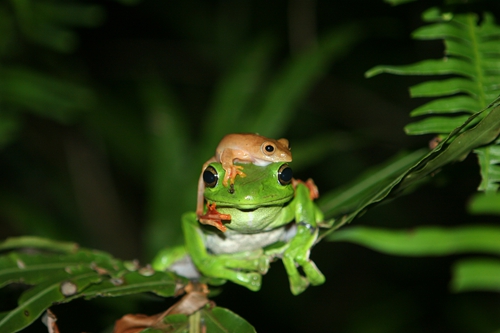 一只雄性红蹼树蛙错抱一只雄性大树蛙