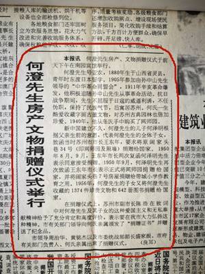 1990年6月中旬的一天,何先生把我(时任党委办公室副主任)叫到她的办公室,讲述了一件她家的 “私事”:她父母生前在苏州陆续购置了包括著名园林——“网师园”在内的多处房产,新中国建立之初,何先生的哥哥即代表家人于1950年7月致函苏州市长王东年,将父母留下的“网师园”及邻近的一处房屋捐赠给了国家(未办理正式捐赠手续);其余几处房产由于种种原因,近40年间,一直由苏州市政府所属的部门占用。1989年,她的妹妹、弟弟几次与苏州市有关方面交涉,要求对这些房产“弄清情况、明确产权、补办正式手续”,但始终未能如愿。何先生要我向所党委转达她的意思,拟委托高能所党委以组织的名义,帮助她向苏州市委转达她们兄弟姐妹的愿望:尽快明确房屋产权,以便她们正式办理捐赠手续。