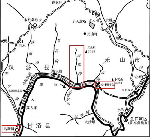 白熊沟位置示意图(图引自百度网,略作修改。图中金口河至乌斯河公路,原是修铁路时开辟的施工便道,考察时早已废弃,无法通行,2000年前后改造成S306线金乌段)