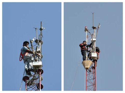 为保障观测数据完整性和连续性,他们恪守职责,当好数据安全卫士,定期前往铁塔查看仪器工作状态,始终如一地坚守在自己的岗位上,用心认真地记录好每一个基础数据,为科研提供科学依据。由于当地雨季长,环境多雨潮湿,太阳能板支架和蓄电池保护箱易受腐蚀,给数据安全传输工作提出了严峻的考验,他们不得不经常攀塔用备件对其更换;在塔体的下风方向,由于塔体阻挡作用,风速会明显减小,而在塔的两侧附近,由于绕流造成的增速效应将使风速测量值偏高,所以气象塔上的测风仪器总是安装在横臂上,以减少影响。但“木秀于林,风必摧之”,此时这个塔身上的突出经常给他们日常工作带来烦恼,这不,当地人过节有放风筝的传统(尼泊尔以“节日之邦”著称于世,每年有110余天为公共假期,几乎每隔几天就有一个节日,有时甚至一个节日接着一个节日)。观测场周围空旷的优势自然是放飞风筝的“风水宝地”,结果造成架在横杆的风速传感器常被缠绕住,越绕越紧,导致风杯停止工作,不得不经常爬上铁塔,戴着草帽、绑着安全绳、呼吸着湿热的空气,行走在令人胆战心惊的高空中,拿出随身携带的老虎钳、螺丝刀,进行清障维护工作。