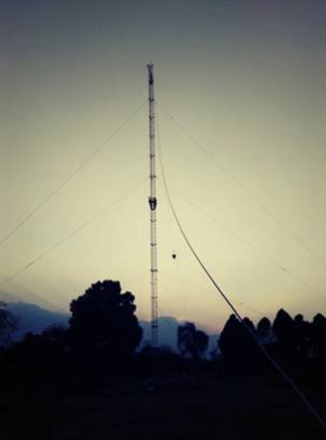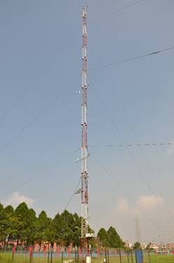 徜徉在地处首都加德满都西南郊该国最高学府Tribhuvan University原生态大学校园内,一定会注意到一座高耸的铁塔。很多人都不知道这个铁塔是干什么用的,甚至有人以为它是一个未竣工的“烂尾塔”。其实抵近一瞧,这可不仅仅是一座孤立的塔身,塔身上还长着很多“东西”呢!其实这座塔为科学院加德满都科教中心大气科学科研团队用作边界层气象观测的“神器”:它矗立于海拔高度1327米处空旷田野中,高40米,为尼泊尔第一高气象观测塔。该座气象塔设有5层观测平台,每层装有测定风、温、湿等气象要素的传感器,可以获得5层不同高度上的观测数据。测量结果用电缆传输至地面采集器进行数据处理。塔上还装有超声测风仪及二氧化碳/水汽通量分析仪等先进仪器,是一个集多层、多参量(指在一个比较复杂的体系中不同的物理属性,比如风速、温度和湿度等)观测系统于一体的低层大气综合探测系统,可实现40米高度内的大气通量和气象场等参量的综合自动观测,并可根据不同项目需要增加观测项目。