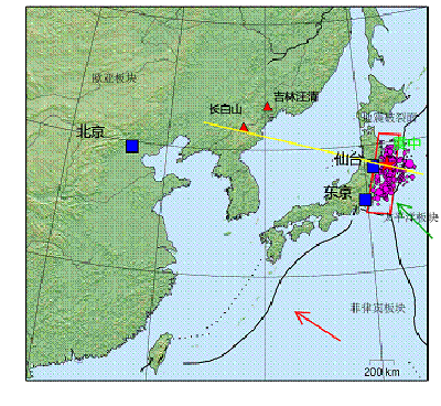 图1.日本大地震及其余震分布图。红色方框表示主震破裂区,绿色五角星为主震破裂开始点,紫色圆圈代表余震。