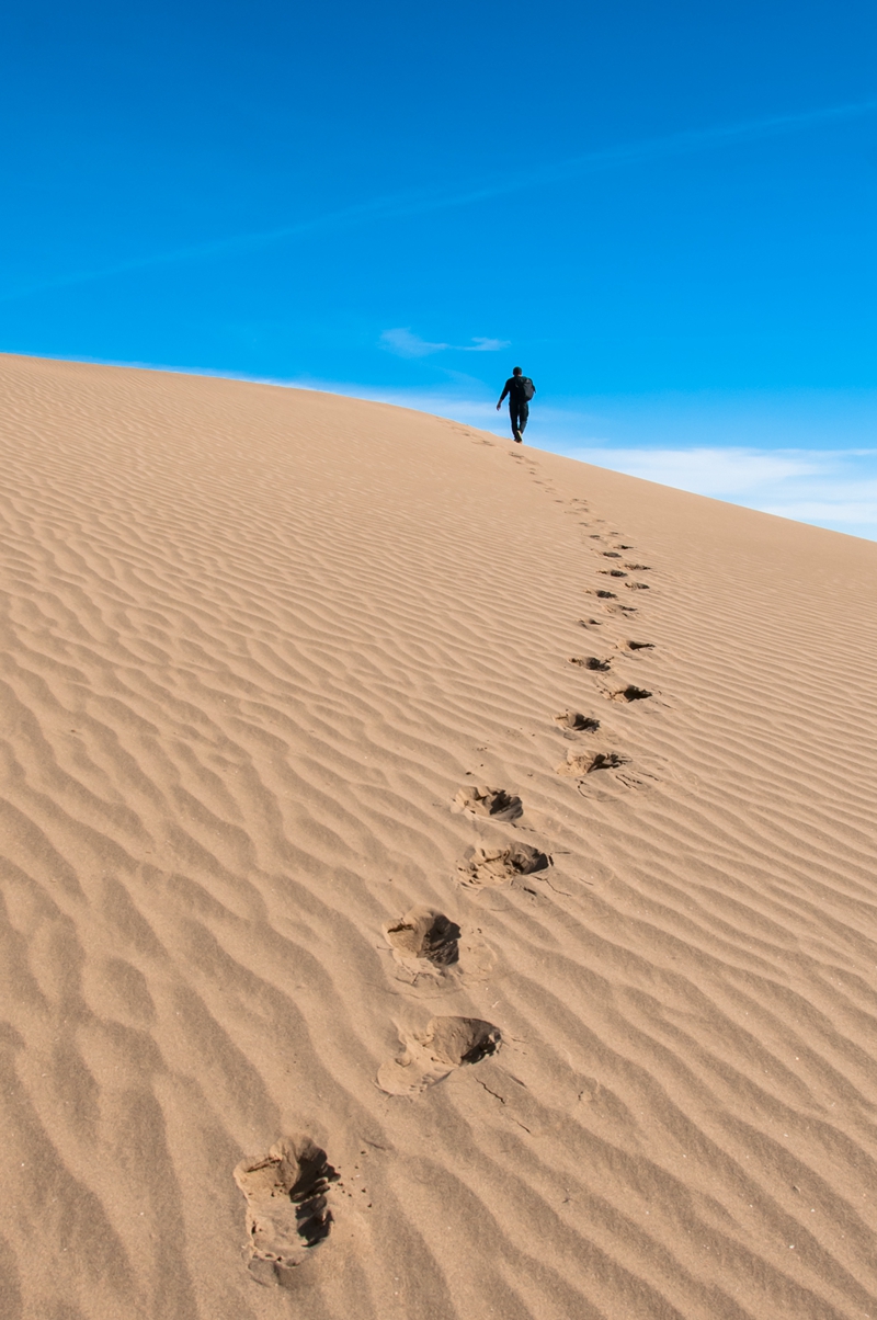 徒步向前。内蒙古额济纳旗附近,由于遗址在沙漠内部,车辆难以到达,考察人员徒步前往遗址时中在沙丘上留下了一串长长的脚印