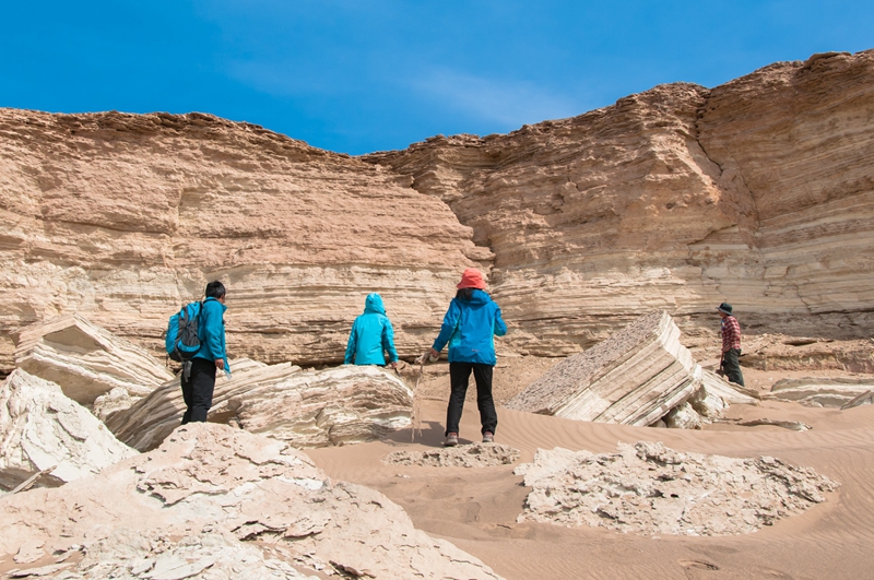 剖面会诊。内蒙古额济纳旗附近,考察队员正在对遗址周边一处因古河道侵蚀而自然出露的剖面进行简单观察与讨论