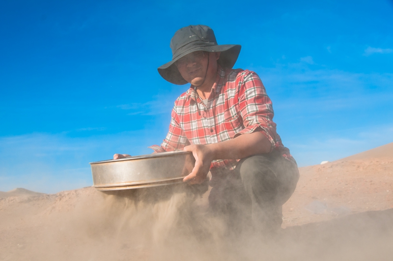 尘土飞扬。内蒙古额济纳旗附近,考察队员正在对遗址地表采集的沉积物进行初步筛选,以此将混杂在细砂中较为细小的人类遗存与地表沉积物快速分离
