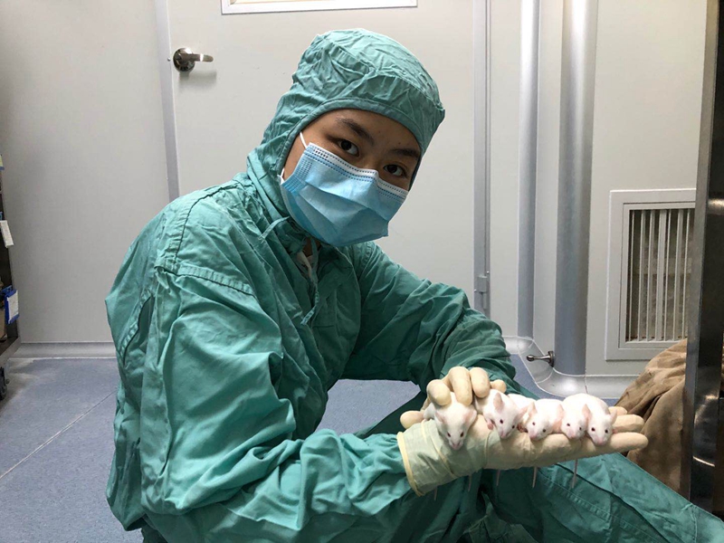 实验人员与小鼠。多年来与实验动物操作经历已经让动物实验操作者和实验动物成为好伙伴。图为实验操作者安抚实验小鼠