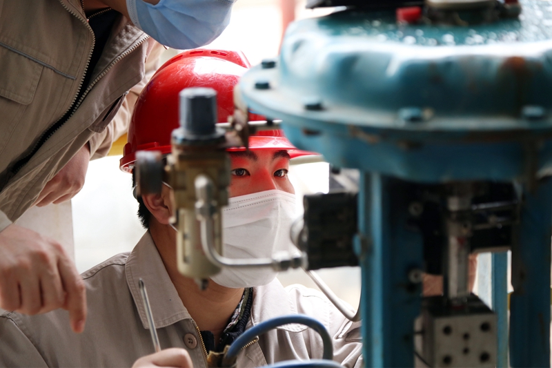 疫情期间,联泓新材料作为山东疫情防控重点物资保障生产企业,不停工不停产,加班加点保生产。在生产基地,仪表聚烯烃班的一线员工邓长宝正佩戴口罩,专注地检查阀门仪表、关注数据变化,在工作细节中践行工匠精神,为安全生产和抗疫贡献力量。