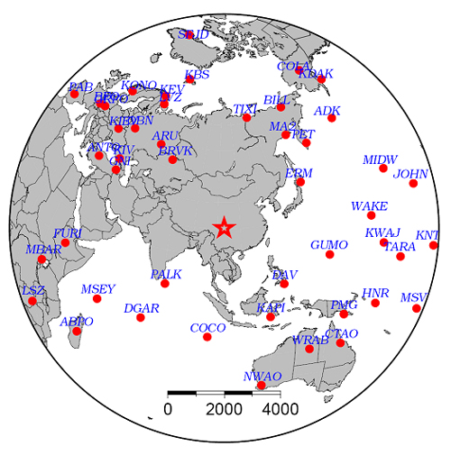 图1. 地震破裂模型采用的远震台站分布图。红色五角星为雅安地震的震中位置,红色圆点为宽频带地震台网的分布图。