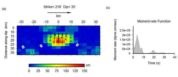 图2. 雅安地震的破裂过程。(a)图中黑色箭头标示破裂滑移方向和大小,黑色等高线为破裂传播时间,水平坐标为219度走向,原点为起震点。纵坐标为沿断层破裂方向距离地表的距离。(b)地震矩释放的时间函数。