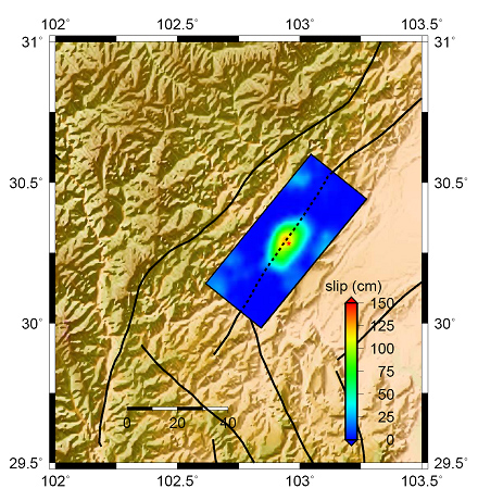 有限破裂源的动态破裂过程如图2所示。可以看出,地震破裂分量主要以逆冲方式为主,起震深度在12.4公里左右,在13公里深度左右滑移量最大,最大滑移量在1.5米左右;断层的破裂面倾角35度,断层走向为219度,推测可能是龙门山的前山断裂。断层破裂主要集中在起震点到两侧20公里的范围内,沿断层倾角方向的范围主要在12―25公里左右。地震主要持续时间20秒左右。从结果来看,地表破裂不显著,在起震点南部10公里范围内可能有局部的地表破裂出现。从地震矩随时间的释放来看,地震主要能量释放位于起震后10秒内,最大达到2e25 dyne*cm/s(达因.厘米/秒),在20秒左右有另一个小的能量释放,可能为地震的破裂释放,也可能属于一个强余震的情况。图3给出了地震破裂在地表的投影情况。