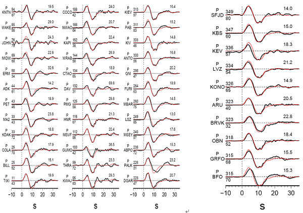 图4. 远震波形的拟合情况。主要为P波的垂直分量。红色为拟合波形,黑色为远震记录。