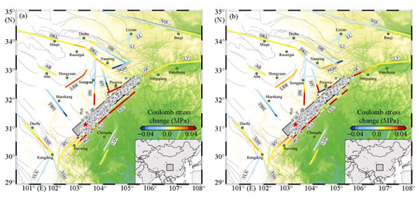 图5. 汶川地震对周边断层库伦应力场的影响。(来自Shan et al., Sci-China Ser-D: Earth Sciences, 2009)