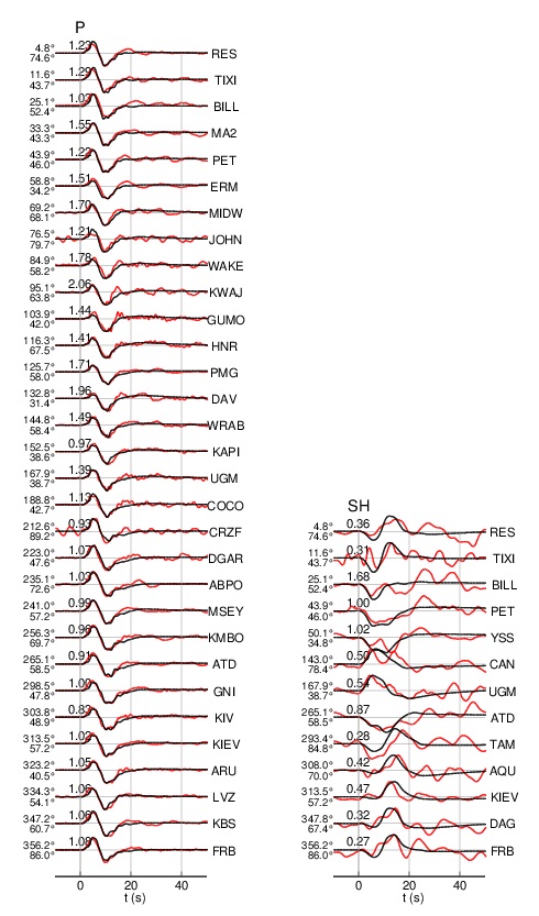 左列为P波垂向位移理论图(红线)与记录(黑线)的对比;右列为SH波切向位移理论图(红线)与记录(黑线)的对比;并给出每个记录的方位角(左上)、震中距(左下)、振幅比(上)和台站名(右)。
