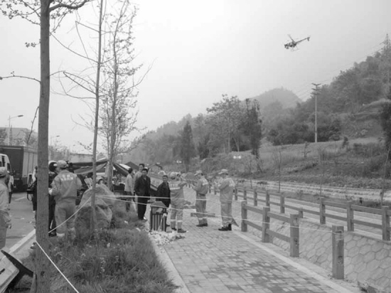 旋翼无人机系统于4月22日上午在芦山县开展现场飞行应用,通过可见光载荷回传视频观测道路受阻情况,并将情况报告给救援队,为疏导由芦山通往宝兴道路上的受阻车辆发挥作用。