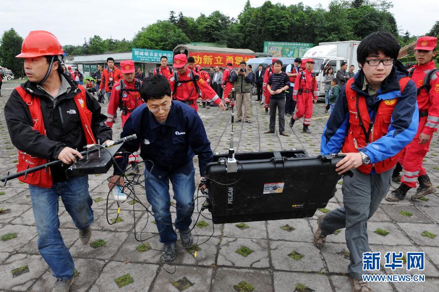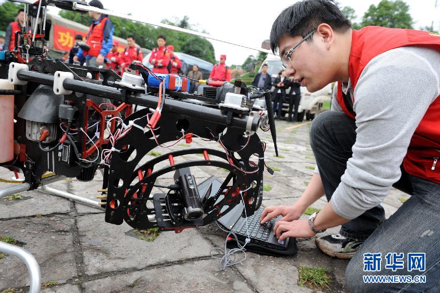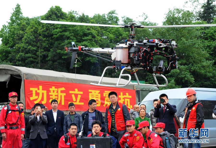 4月24日,工作人员把无人机控制台搬出。在本次雅安地震搜救过程中,国家地震灾害紧急救援队使用空中搜索探测机器人(又名旋翼无人机)对灾区地形地貌、受损情况进行空中排查,为国家地震灾害紧急救援队的搜救工作提供了参考和依据。据介绍,该无人机由国家地震灾害紧急救援队与中国科学院沈阳自动化研究所联合研制,并在地震搜救过程中应用,探测精度达到0.1米,可在200米低空连续飞行100公里。