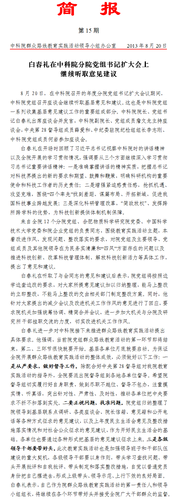 第15期:白春礼在中科院分院党组书记扩大会上继续听取意见建议