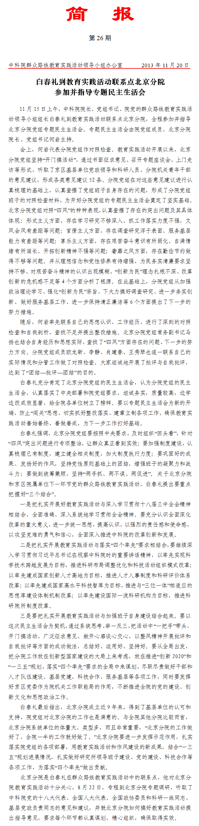 第26期:白春礼到教育实践活动联系点北京分院参加并指导专题民主生活会