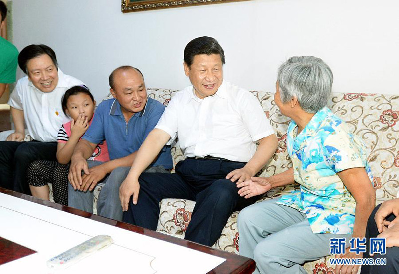 7月11日至12日,中共中央总书记、国家主席、中央军委主席习近平在河北省调研指导党的群众路线教育实践活动。这是在正定县塔元庄村村民解建勇(左三)家,习近平同一家三代围坐一起,详细询问家庭收入怎么样、孩子书读得怎么样、村里的公共服务好不好。新华社记者李涛摄