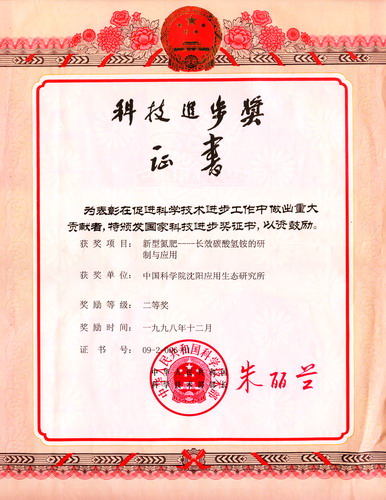 第一完成单位:沈阳应用生态研究所 获奖奖种:国家科技进步奖 获奖时间:1998 获奖等级:2 内容简介: 中国科学院沈阳应用生态所在有关单位的支持下,历经14年研究,在碳酸氢铵生产系统中添加铵稳定剂DCD,生产出碳酸氢铵的改性新品种—长效碳酸氢铵。它保持了碳酸氢铵的有点,克服了它的主要缺点。长效碳酸氢铵的氮素利用率比普通碳酸氢铵提高10个百分点,达到35%以上,略高于尿素;肥效期可由原来的30-45天延长效碳酸氢铵90-110天,长效碳酸氢铵作基肥一次性施入,基本可以满足作物整个生长期的用肥需要,省去追肥工序,为免中耕农业、覆膜农业和节水农业提供方便;在等氮量施肥条件下可增产13%左右,在同等产量情况下可节肥25%-30%;且不结硬块,给储存和使用带来方便,该项技术为我国碳酸氢铵产品的改性闯出一条投资少,见效快,效益高的可行之路。