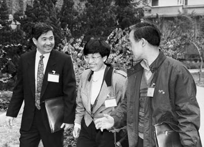 20世纪80年代从美国回国定居的三位青年科学家李家明(左)、赵玉芬(中)、苏纪兰(右)于1991年11月当选为中国科学院学部委员。图为1992年4月他们并肩出席第六次学部委员大会。
